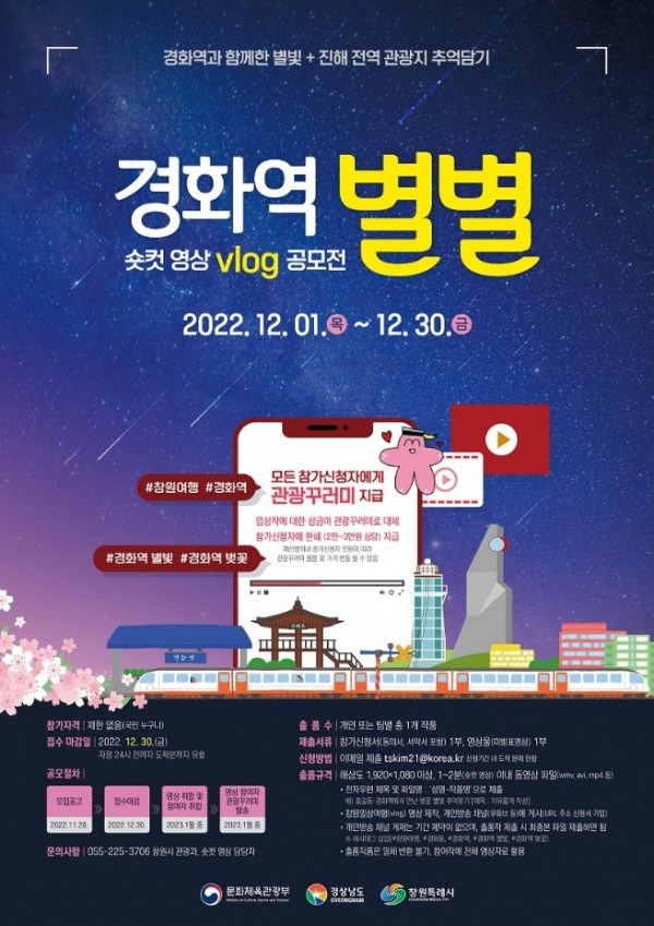 창원시 관광콘텐츠 발굴과 일상여행 활성화를 위해 전 국민의 사랑을 받는 벚꽃명소 경화역의‘벚꽃’과 경화역 밤하늘을 수놓은‘별빛’향연 등 진해 전역을 나만의 영상에 담아보는 「경화역 별별 숏컷 영상 (vlog) 공모전」을 개최