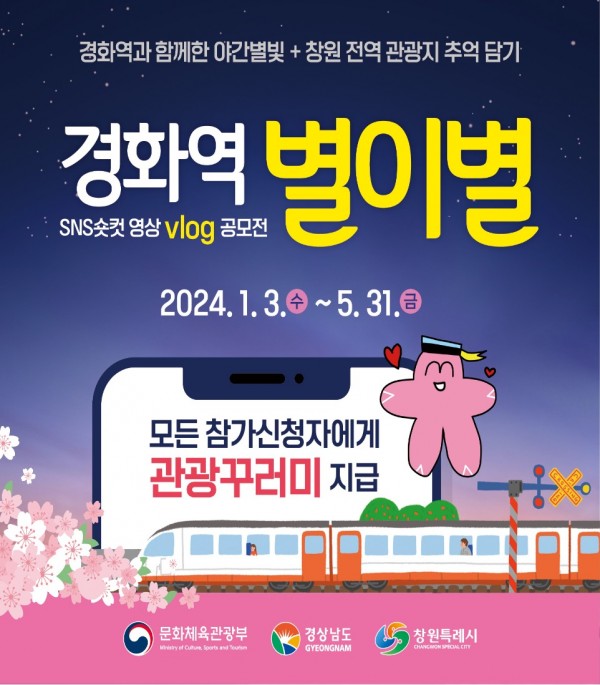 창원시는 관광콘텐츠 발굴과 일상여행 활성화를 위해 전 국민의 사랑을 받는 벚꽃명소 경화역의‘벚꽃’과 경화역 밤하늘을 수놓은‘별빛’향연 등 창원 전역을 나만의 영상에 담아보는 「경화역 별이별 숏컷 영상 (vlog) 공모전 (기한연장)」을 재공고 하오니 많은 관심과 참여 바랍니다.
